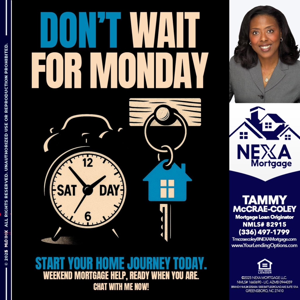Hi, my name is Tammy C. McCrae-Coley. I’m a Loan Officer with NEXA Mortgage LLC., offering personalized mortgage solutions, fast customized quotes, great rates and service with integrity.