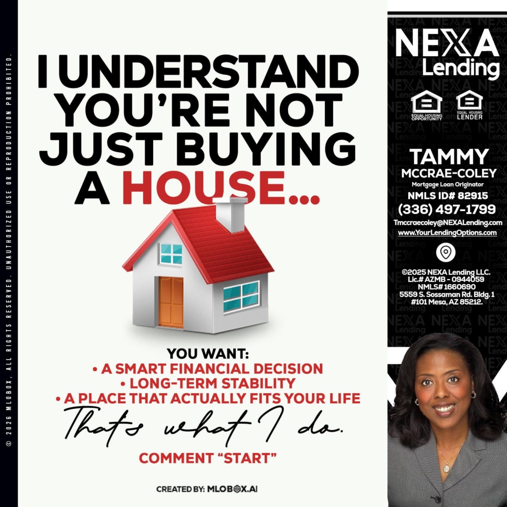 Hi, my name is Tammy C. McCrae-Coley. I’m a Loan Officer with NEXA Lending LLC., offering personalized mortgage solutions, fast customized quotes, great rates and service with integrity.
