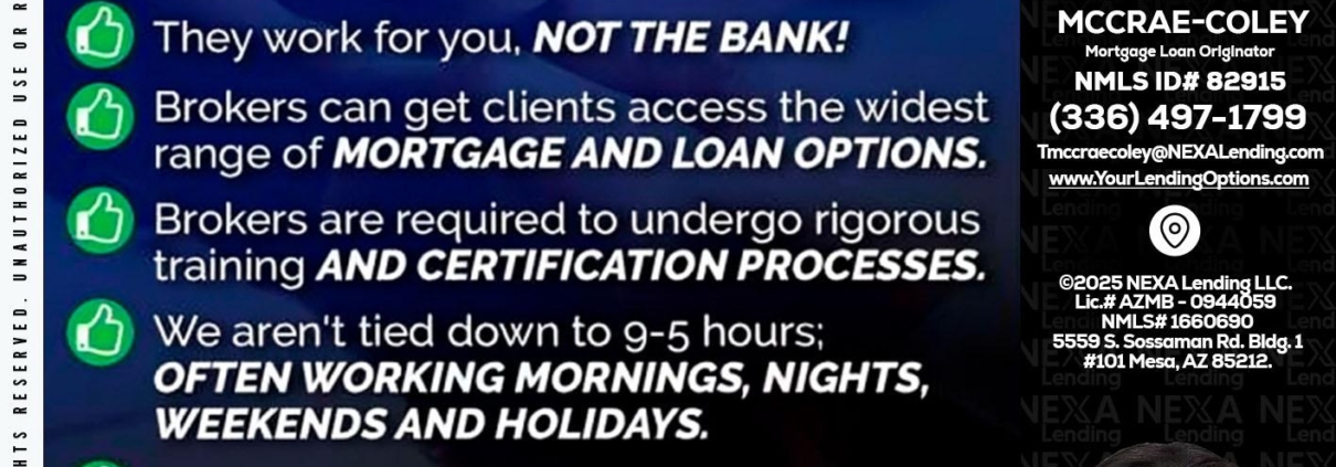 Hi, my name is Tammy C. McCrae-Coley. I’m a Loan Officer with NEXA Lending LLC., offering personalized mortgage solutions, fast customized quotes, great rates and service with integrity.