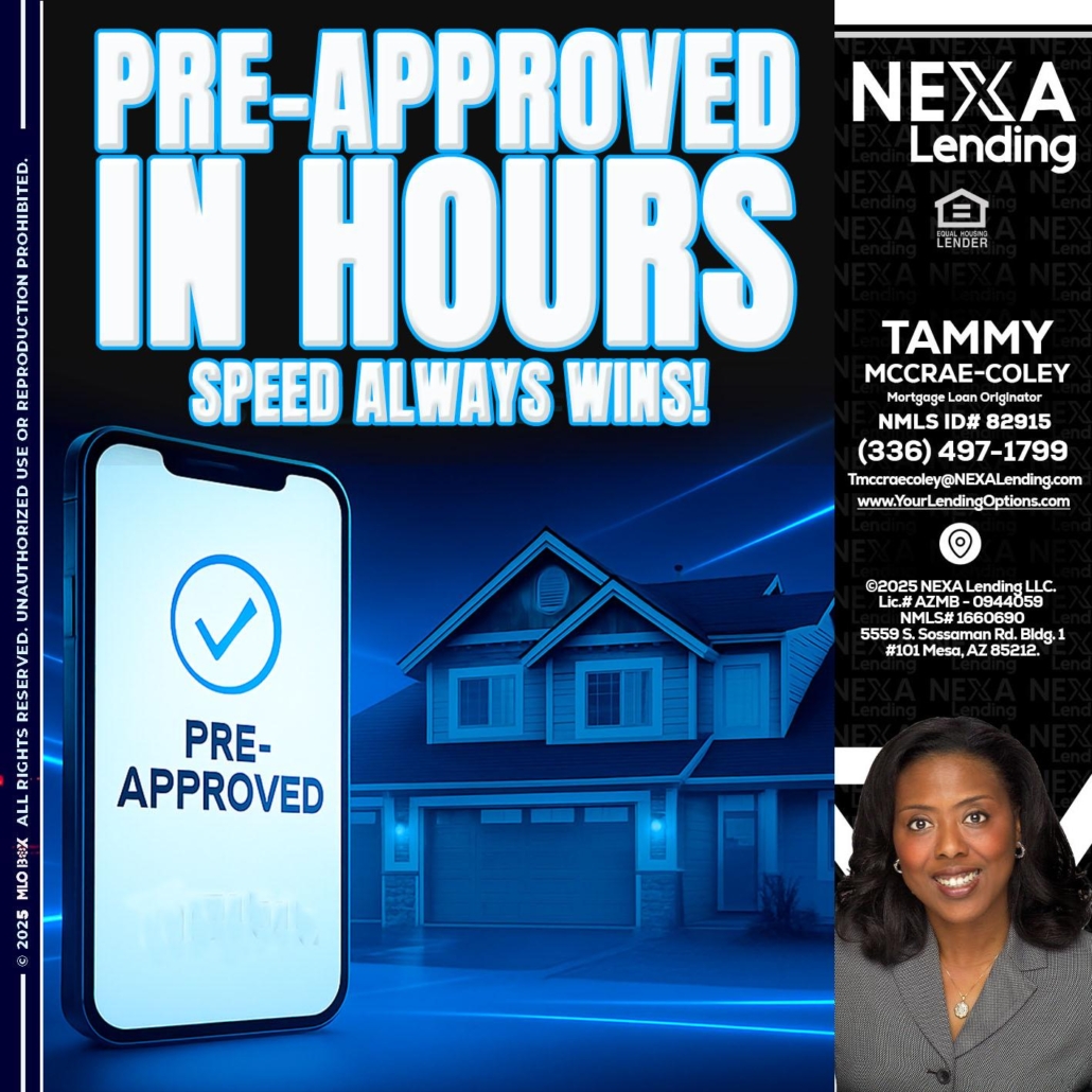 Hi, my name is Tammy C. McCrae-Coley. I’m a Loan Officer with NEXA Mortgage LLC., offering personalized mortgage solutions, fast customized quotes, great rates and service with integrity.