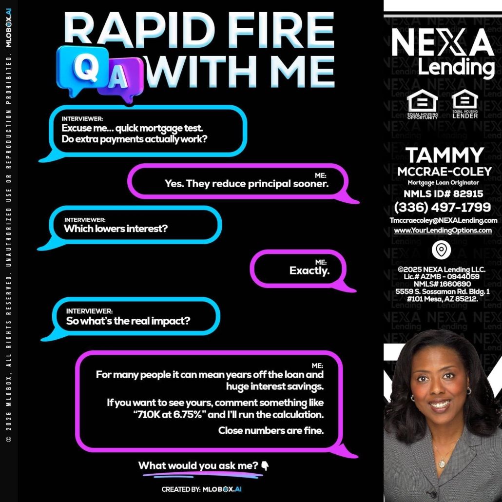 Hi, my name is Tammy C. McCrae-Coley. I’m a Loan Officer with NEXA Lending LLC., offering personalized mortgage solutions, fast customized quotes, great rates and service with integrity.