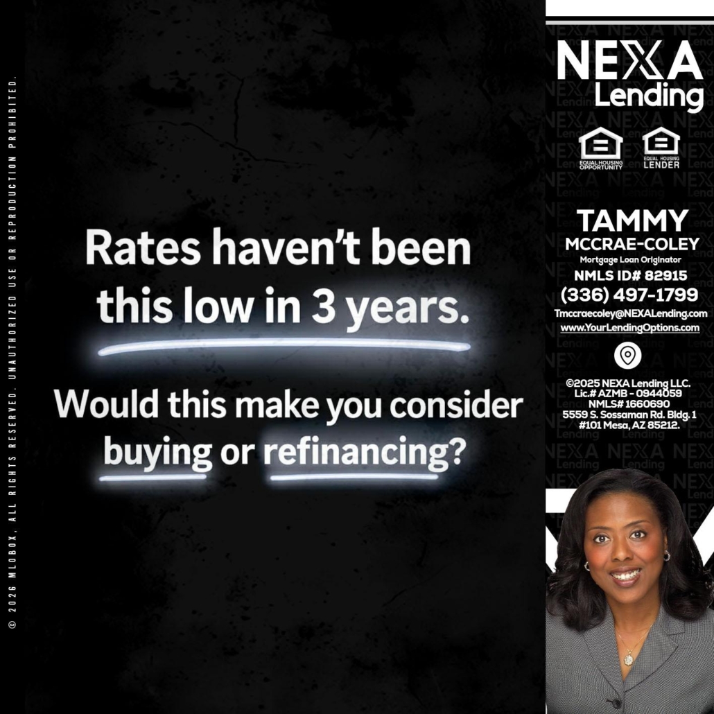 Hi, my name is Tammy C. McCrae-Coley. I’m a Loan Officer with NEXA Lending LLC., offering personalized mortgage solutions, fast customized quotes, great rates and service with integrity.
