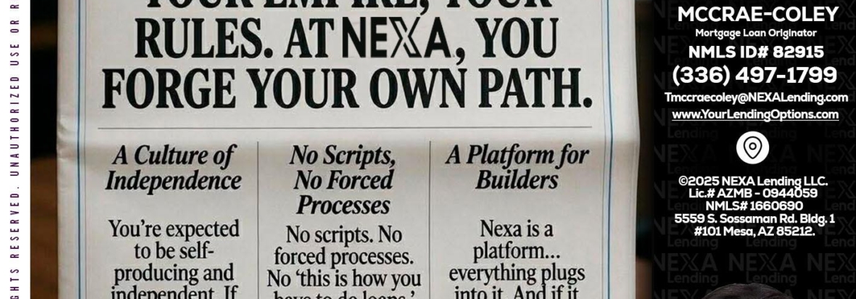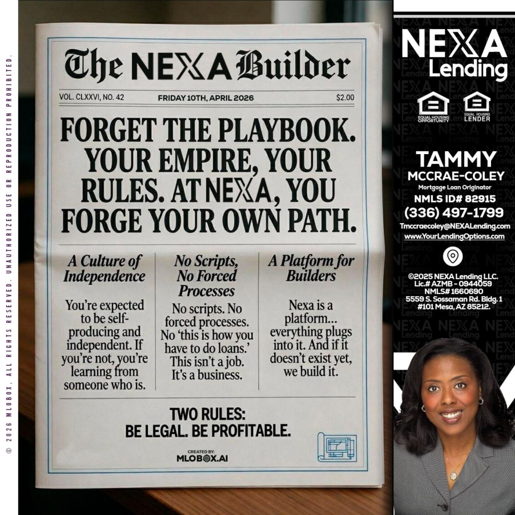 Hi, my name is Tammy C. McCrae-Coley. I’m a Loan Officer with NEXA Lending LLC., offering personalized mortgage solutions, fast customized quotes, great rates and service with integrity.